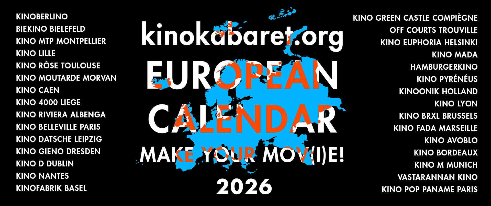 HAMBURGERKINO, Germany: 16. - 18. January - Turbo KabaretKINO D, Dublin, Ireland: 24. - 25. JanuaryKINO M Munich, Germany: 4. - 9. February - Long Weekend KabaretKINO GAP, Champoléon, France: 24. February - 1. March - Alpine KinoKINO CUNTRA Graz, Austria: 19. - 23. MarchKINO D, Dublin, Ireland: 21. - 22. March (weekend)KINO PRAHA, Prague, Czech Republic 24. - 29. MarchKINO CAEN, France: 27. March - 3. AprilKINO DRAMAWAS Innsbruck, Austria: 30. March - 4. April - Alpine KinoFILMONIK Manchester, United Kingdom: 2. - 5. April - Mini KabaretKINO TLV Tel Aviv, Israel: 4. - 11. April (1st time)KINO GENT Nogent-le-Rotrou, France: 4. - 6. April (weekend)KINO DATSCHE Leipzig, Germany: 6. - 12. April (1st time)KINO LIEGE, Belgium: 12. - 18. AprilKINOPHILIA Linz, Austria: 15. - 22. April (1st time)KINO BELLEVILLE Paris, France: 17. - 24. AprilINTL. KINOKABARET Brussels, Belgium: 22. April - 2. MayKINOLAB Moscow, Russia: 30. April - 7. May (Register until March 26)KINO M Munich, Germany: 8. - 17. MayKINO D Dublin, Ireland: 23. - 24. May (weekend)HAMBURGERKINO, Germany: 30. May - 6. June (sold out, registration closed)KINO NAPOLI, Italy: 11. - 18. June (sold out, registration closed)Ibiza Back²Life, Spain: 15. - 21. June (Island Kabaret only once)KINO BRISSAC, France: 19. - 27. June - KINO MONTPELLIER feat. KINO (B)WROC & ROLL KINO Wroclaw, Poland: 27. June - 3. JulyKINO MOSCOW, Russia: 1. - 10. JulyCHATO'KINO Chateau-Gontier, France: 2. - 5. JulyKINO EUPHORIA, Helsinki, Finland: 2. - 10. JulyKINO D Dublin, Ireland: 12. - 19. JulyFILMONIK Manchester, United Kingdom: 25. July - 2. AugustKINOKABARET @ LAGO Filmfest, Italy: 27. - 30. July (first time)KINO DYNAMIQUE VIENNA, Austria: 7. - 14. August (Number 11)KINO PRIZREN, Kosovo: 9. - 13. AugustKINO PAL Jenin, Palestine: ??? AugustKINOFABRIK BASEL, Switzerland: 11. - 16. AugustKINO MAINZ, Germany: 15. - 21. AugustKINO CAROLO Charleroi, France: 22. - 30. August (first time)KINOMOUTARDE Dijon, Morvan, France: 23. - 29. August (sold out)KINO TOULOUSE, France: 24. - 29. AugustKINOBERLINO, Germany: 29. August - 6. September (Number 12)OFF COURTS Trouville, France: 4. - 12. SeptemberKINODYNAMIQUE Jena, Germany: 7. - 18. SeptemberKINO PA Palermo, Italy: 14. - 19. SeptemberKINO PRAHA Prague, Czech Republic 18. - 25. September